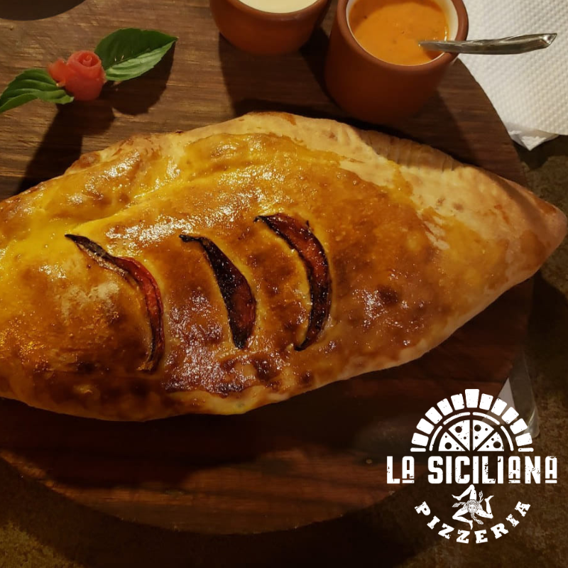 Disfruta de la irresistible empanada de La Siciliana Pizzeria. La imagen muestra una empanada de masa horneada a la perfección, con un exterior dorado y brillante que promete un interior jugoso y sabroso. Los pimientos asados se asoman entre la masa, añadiendo un toque de color y sabor. Acompañada de salsas, esta calzone es la opción ideal para una comida deliciosa.